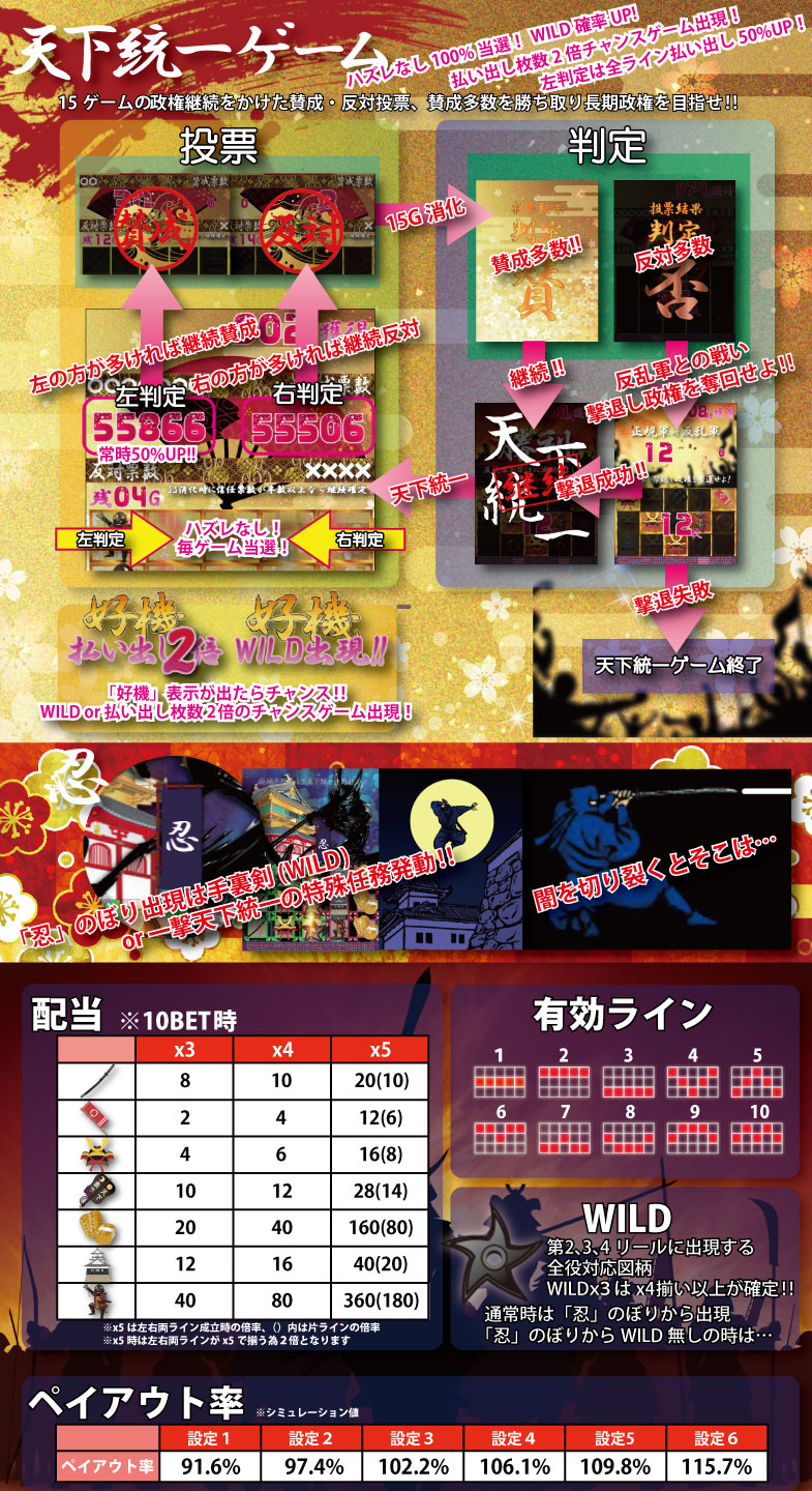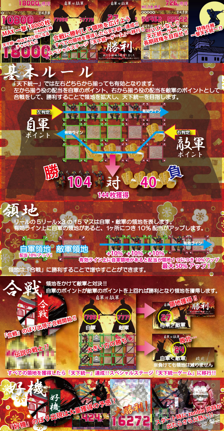 Import Edition「天下統一」はMAXベット専用機です(チケットエリアの場合は25枚/50枚/100枚の3種類の台からお選び頂けます)。