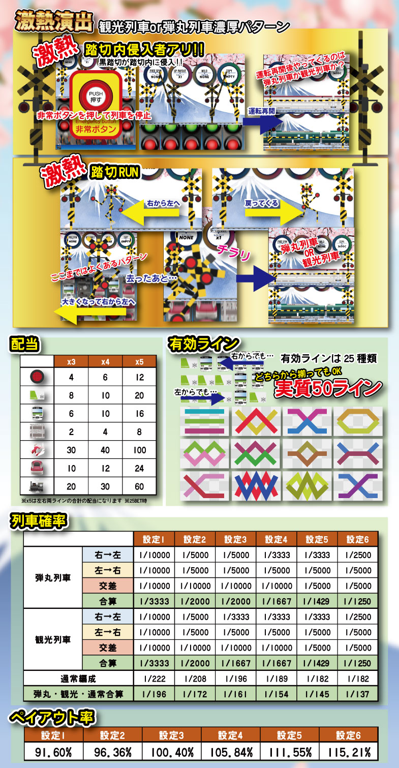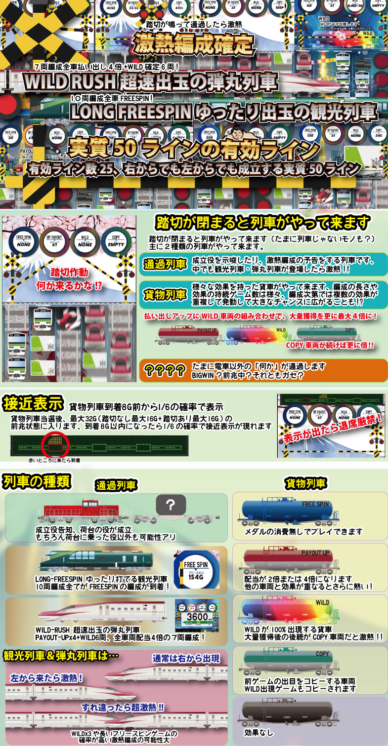 Import Edition「RAILWAY CROSSING -Japanese Style -」はMAXベット専用機です(チケットエリアの場合は25枚/50枚/100枚の3種類の台からお選び頂けます)。