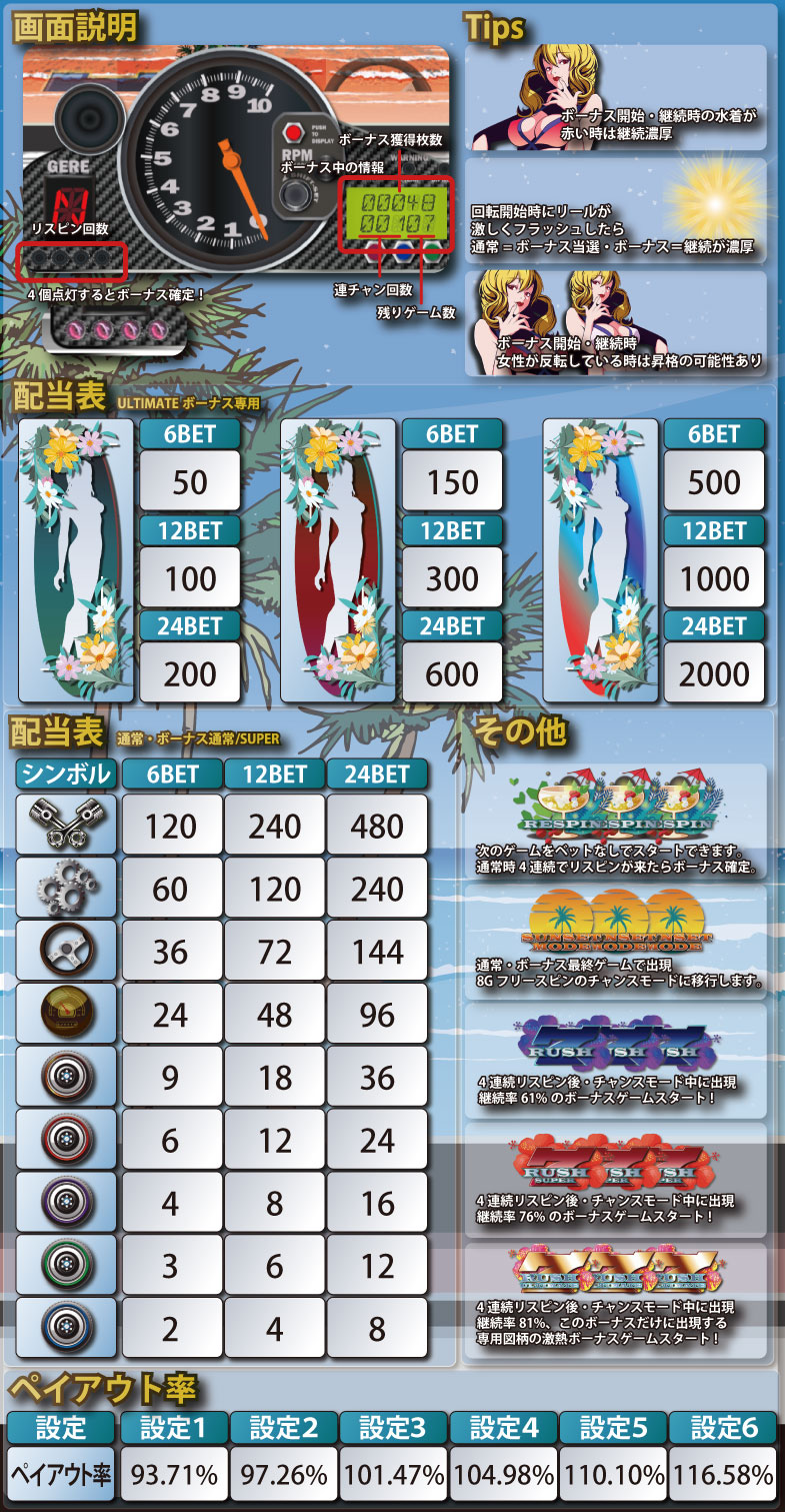 Import Edition「STREET RACING」では1回のゲームで5Ptまたは25枚/50枚/100枚のスロットメダルをベットすることができ、対応するラインに各絵柄が揃うと払出しを受けることが出来ます。