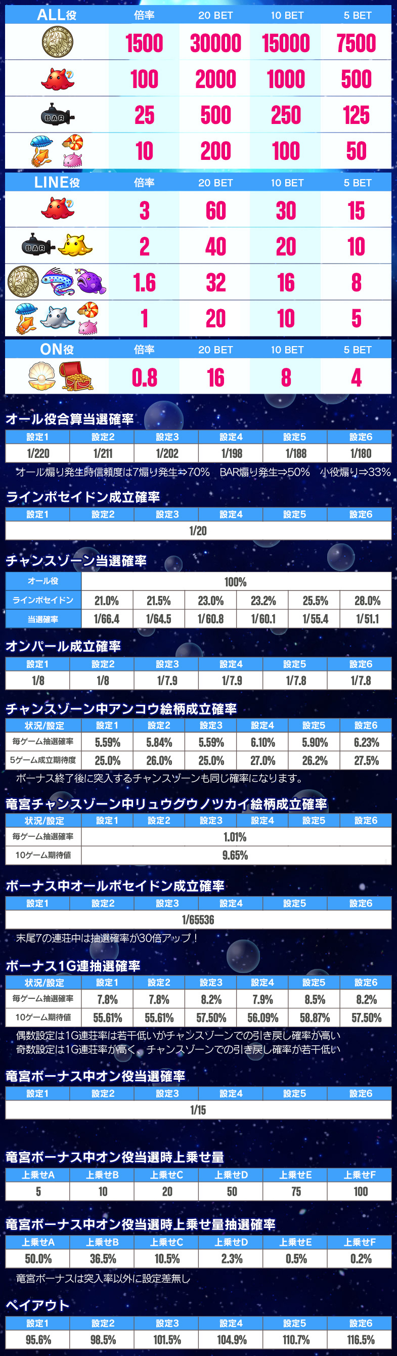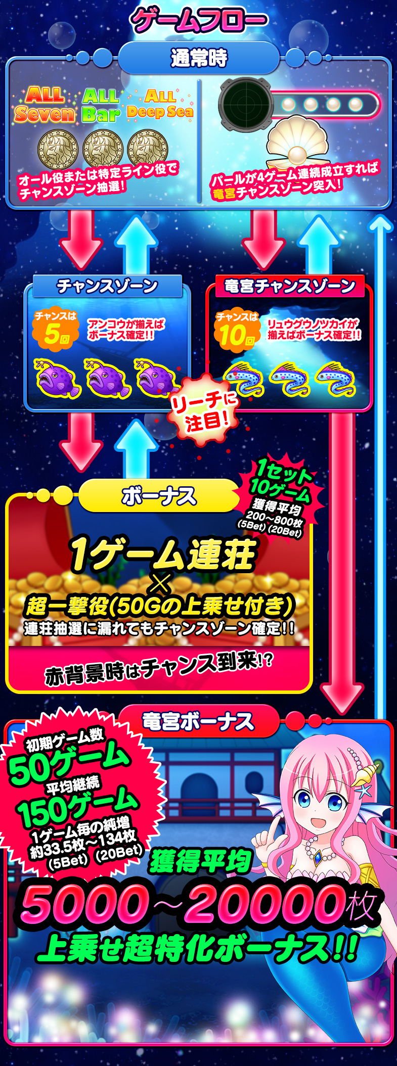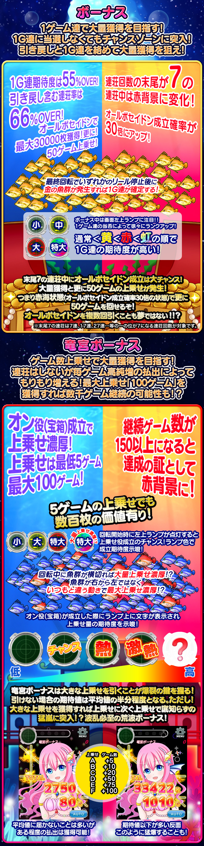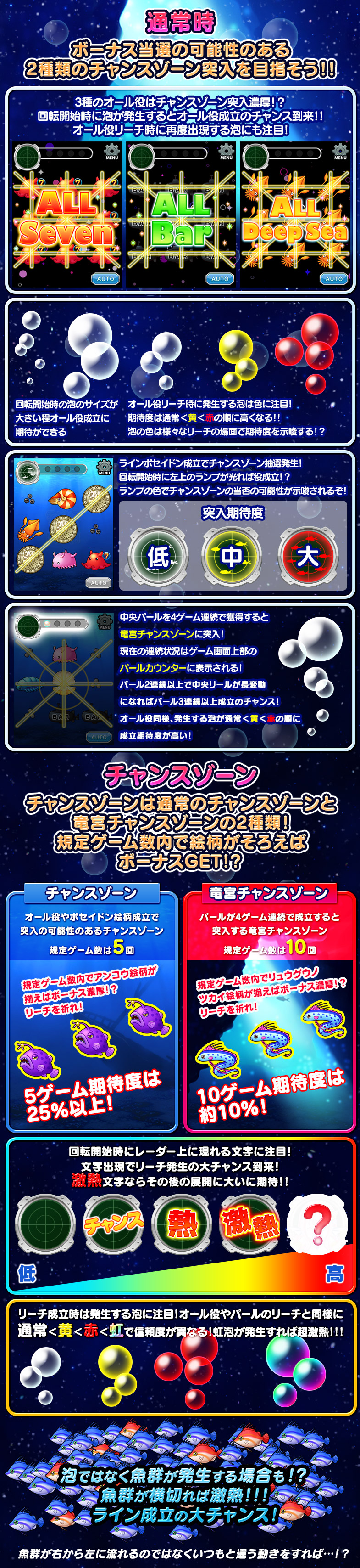 8ラインスロット「深海伝説」はMAXベット専用機です(MAXベットはポイントエリアの場合5ポイントのみとなります。チケットエリアの場合は5枚/10枚/20枚の3種類の台からお選び頂けます)。