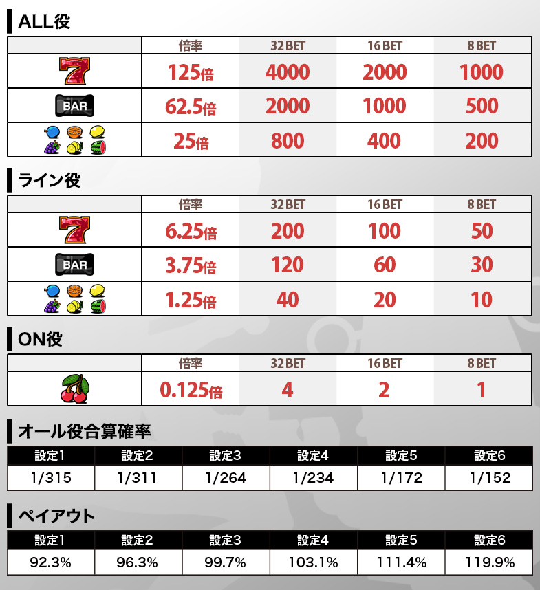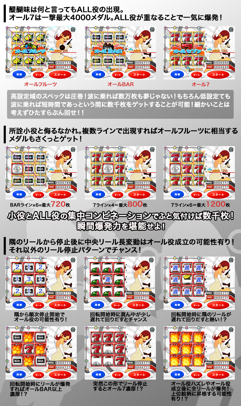 設定が高い程メダルを獲得する可能性が高くなります。詳細はスペック表にてご確認ください。