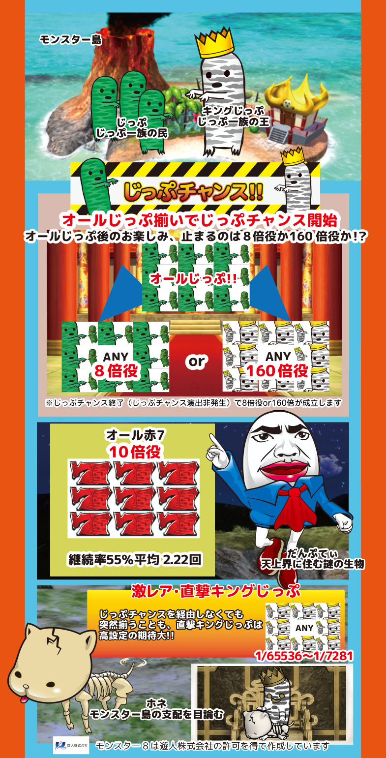 8ラインスロット「モンスター8」はMAXベット専用機です(MAXベットはポイントエリアの場合5ポイントのみとなります。チケットエリアの場合は5枚/10枚/20枚の3種類の台からお選び頂けます)。