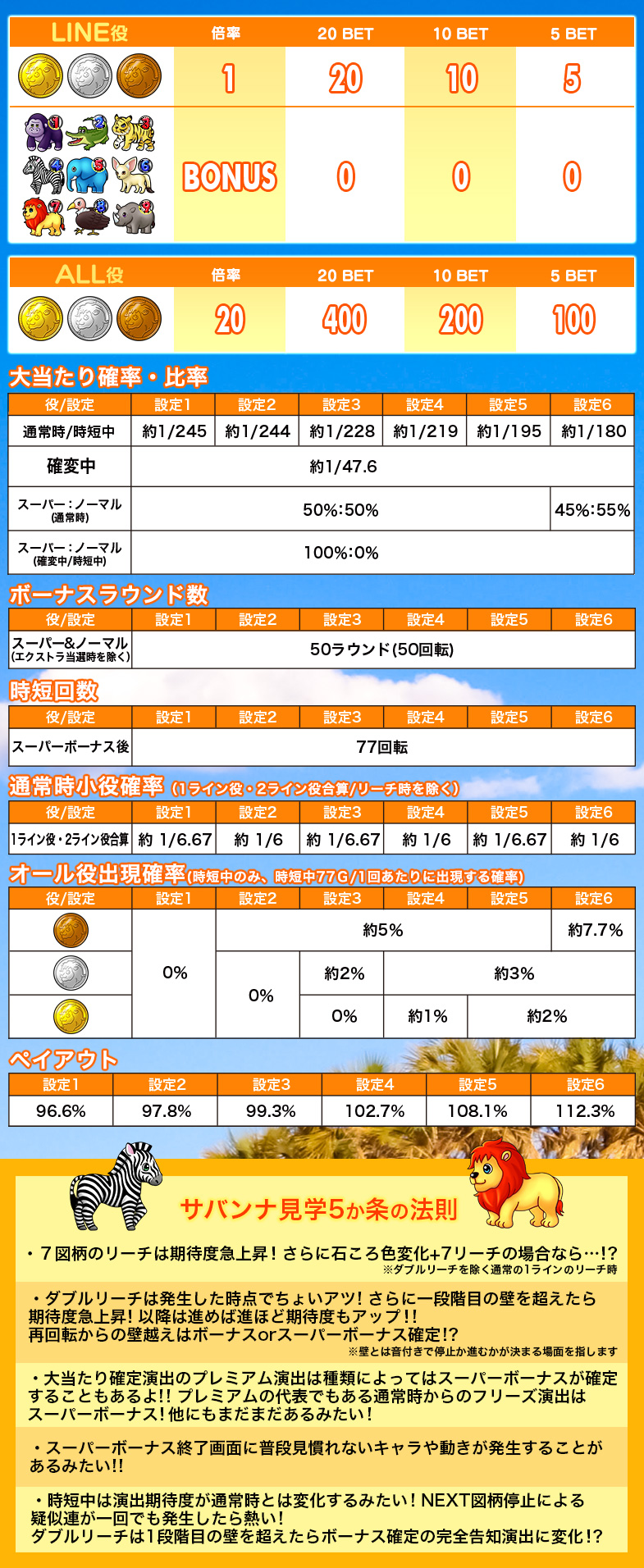 8ラインスロット「サバンナツアーズ」はMAXベット専用機です(MAXベットはポイントエリアの場合5ポイントのみとなります。チケットエリアの場合は5枚/10枚/20枚の3種類の台からお選び頂けます)。