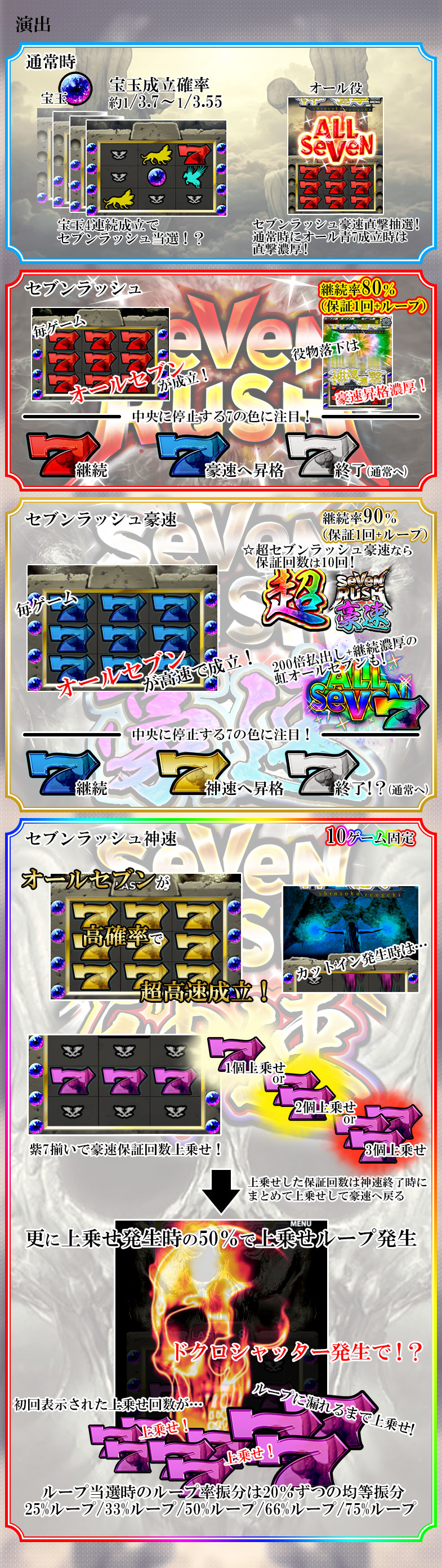 機種のスペックや、省電力モード等の性能を制限する機能がONの場合、リール停止や演出が正常に表示されない可能性がございます。