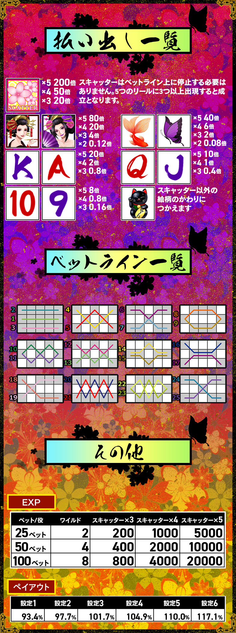 5リールスロット「桜花伝」はMAXベット専用機です(25枚/50枚/100枚の3種類の台からお選び頂けます)。 -